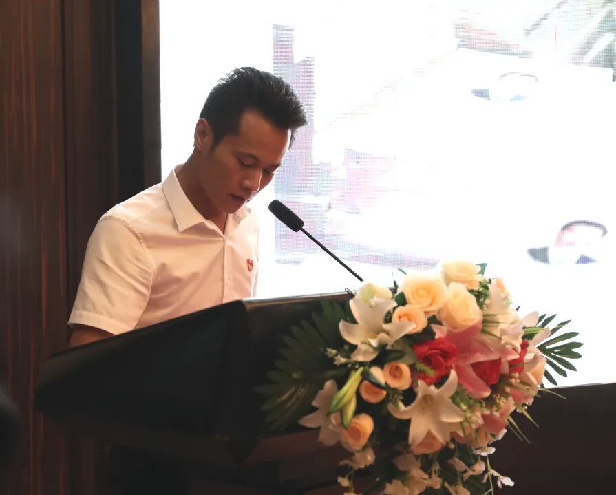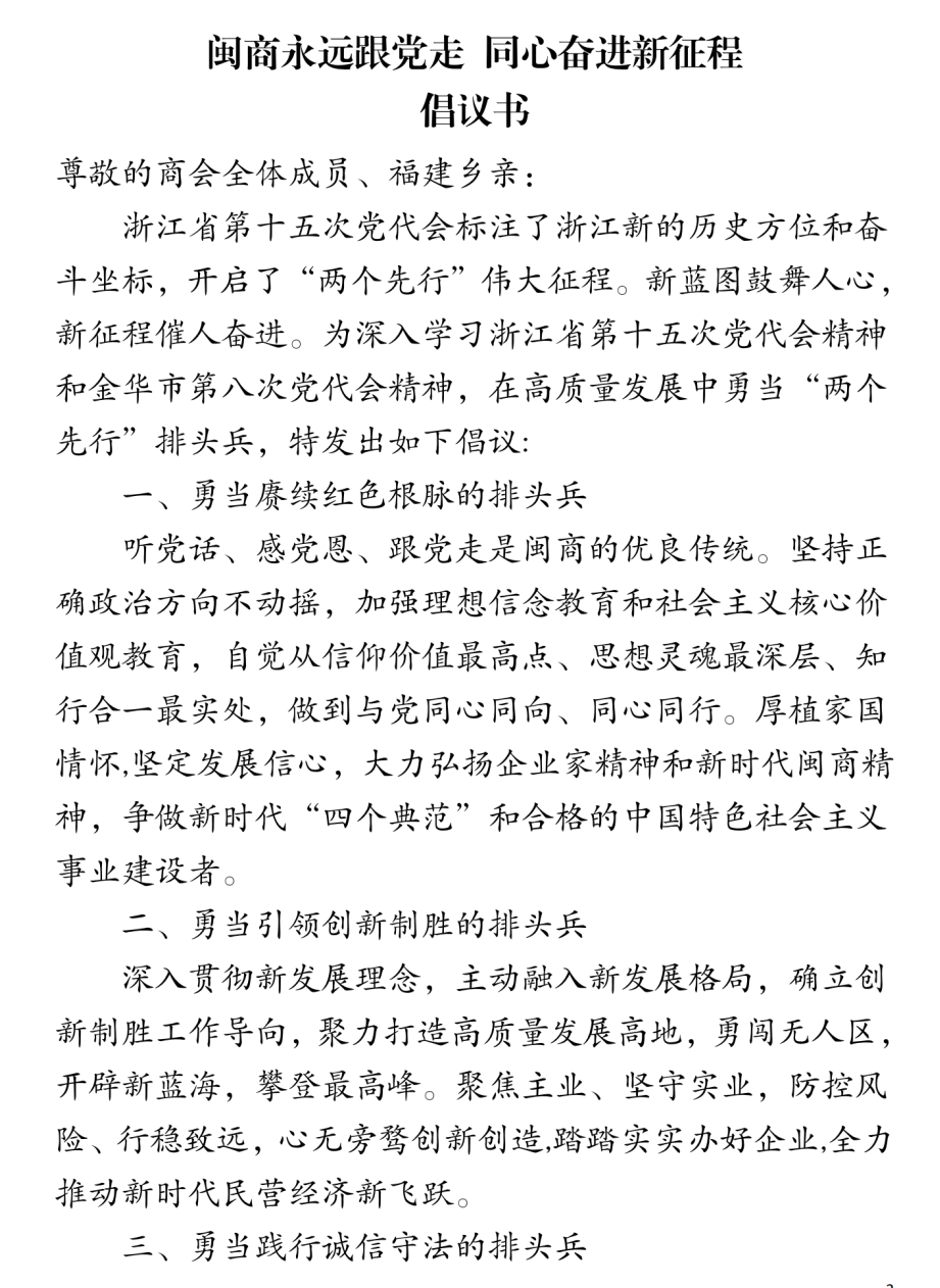 3、为深入学习浙江省第十五次党代会和金华市第八次党代会精神,不断践行“两个健康”,在高质量发展中勇当“两个先行”排头兵,我会向全体成员发出《闽商永远跟党走,同心奋进新征程》倡议,由执行会长邓建财宣读倡议书。