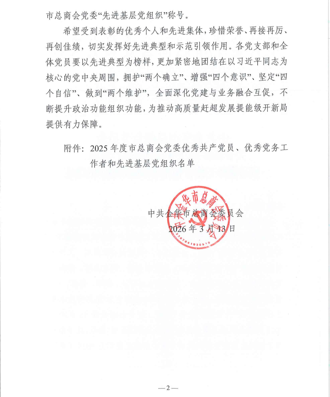 3月13日,中共金华市总商会委员会发布《关于表彰 2025 年度优秀共产党员、优秀党务工作者和先进基层党组织的决定》(金商党〔2026〕5 号),中共金华市福建商会支部委员会再次荣获“先进基层党组织”称号!