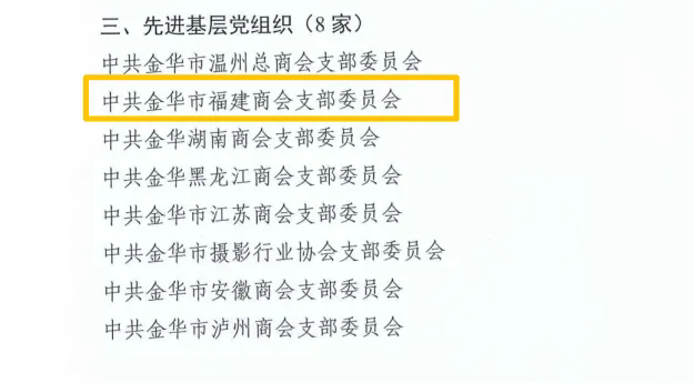 荣誉的获得,既是鼓励与肯定,更是责任与鞭策。多年来,金华市福建商会党支部始终坚守初心、主动担当、积极作为,扎实推进各项党建工作落地见效,充分发挥党组织战斗堡垒作用和党员先锋模范作用。党支部将以此次荣誉为新起点,持续加强自身建设,不断强化党建引领作用,努力提升党支部的凝聚力和战斗力,为推动商会发展、服务社会、助力地方经济发展作出新的更大贡献。