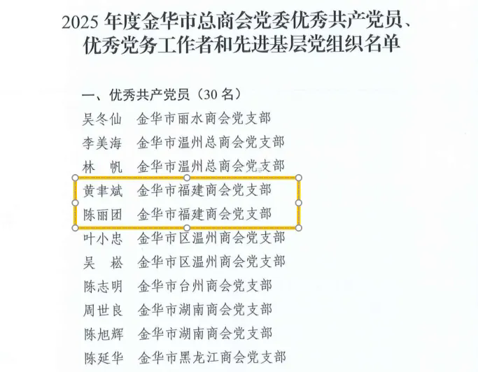 热烈祝贺金华市福建商会党支部宣传委员黄连英同志被授予2025年度“优秀党务工作者”称号,党员黄聿斌、陈丽团同志被授予2025年度“优秀共产党员”称号。