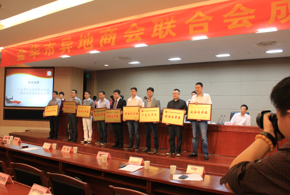 昨天下午,金华市异地商会联合会在金华市文化中心成立。金华市有关领导接见了首届联合会各成员商会会长,并进行了座谈。11家在金异地商会的100多名会员代表共同见证了联合会成立,金华市台州商会会长颜文玲被推选为首届会,金华市福州商会会长黄昭作为副会长上台进行接牌仪式。
