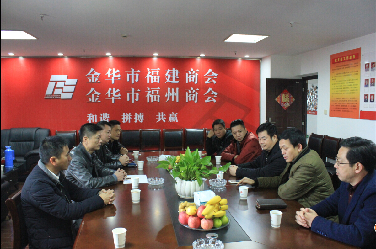2015年12月9日金华市工商联章国标副主席、许国鲜副主席一行三人到金华市福建商会进行异地商会发展经验的工作交流。福建商会会长黄昭云、常务副会长陈永强、支部书记张上树、副会长洪维浅、何福昌热情接待,陪同参观我会办公环境并逐一介绍商会各部门及工作进展。参观完毕后,在商会会议室开展了简短的工作会议,两位领导对我会各项工作的开展给予了高度认可,并表示对未来的商会前景非常看好。