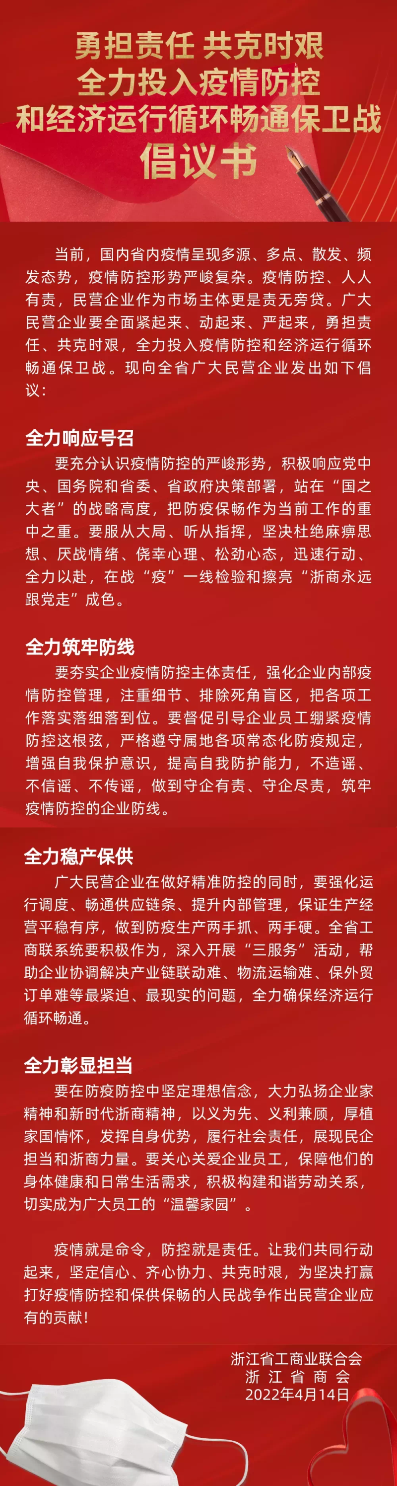 近日,国内、省内疫情呈现多源、多点、散发、频发态势,金华市也出现新冠病毒确诊病例患者,疫情防控形势严峻复杂。4月14日,浙江省工商联向全省广大民营企业发出《勇担责任 共克时艰全力投入疫情防控和经济运行循环畅通保卫战倡议书》,号召大家紧起来、动起来、严起来,勇担责任、共克时艰。