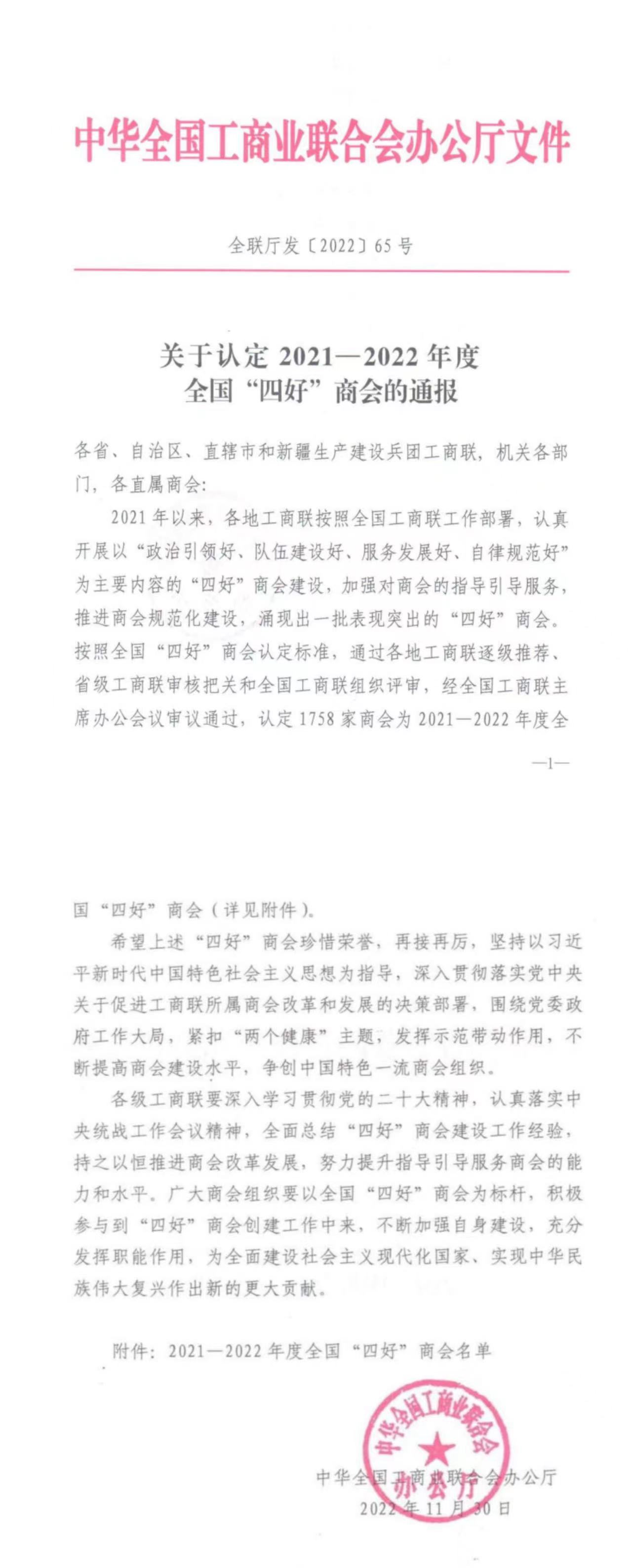 全国工商联按照全国“四好”商会认定标准,通过各地工商联逐级推荐、省级工商联审核把关和全国工商联组织评审,经全国工商联主席办公会议审议通过,认定金华市福建商会为2021—2022年度全国“四好”商会!