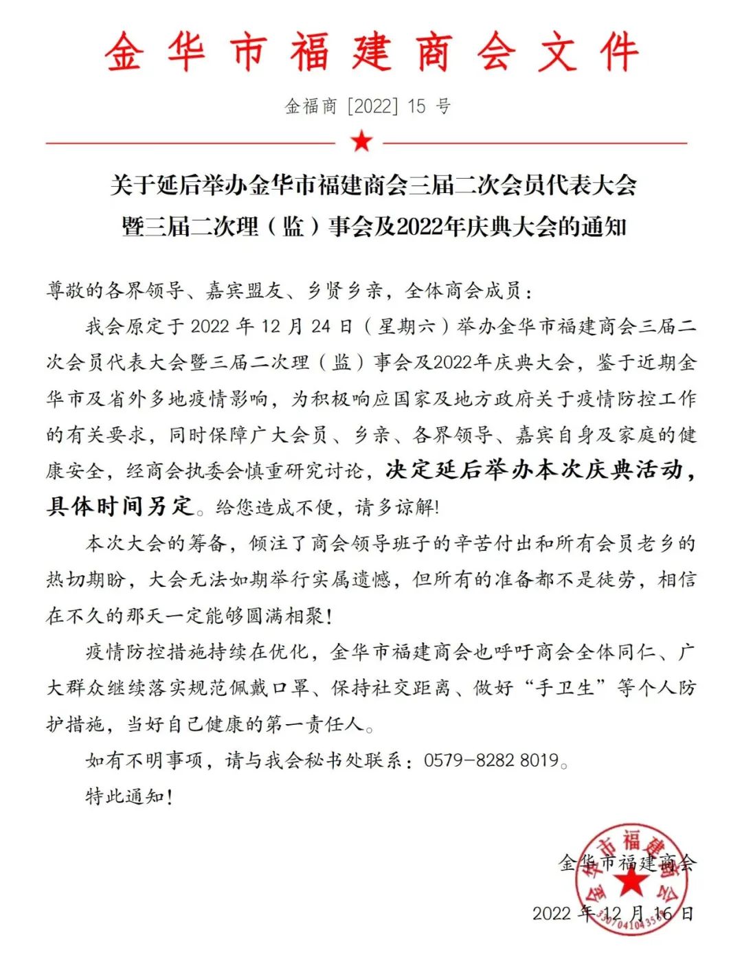 关于延后举办金华市福建商会三届二次会员代表大会暨三届二次理 ( 监) 事会及2022年庆典大会的通知