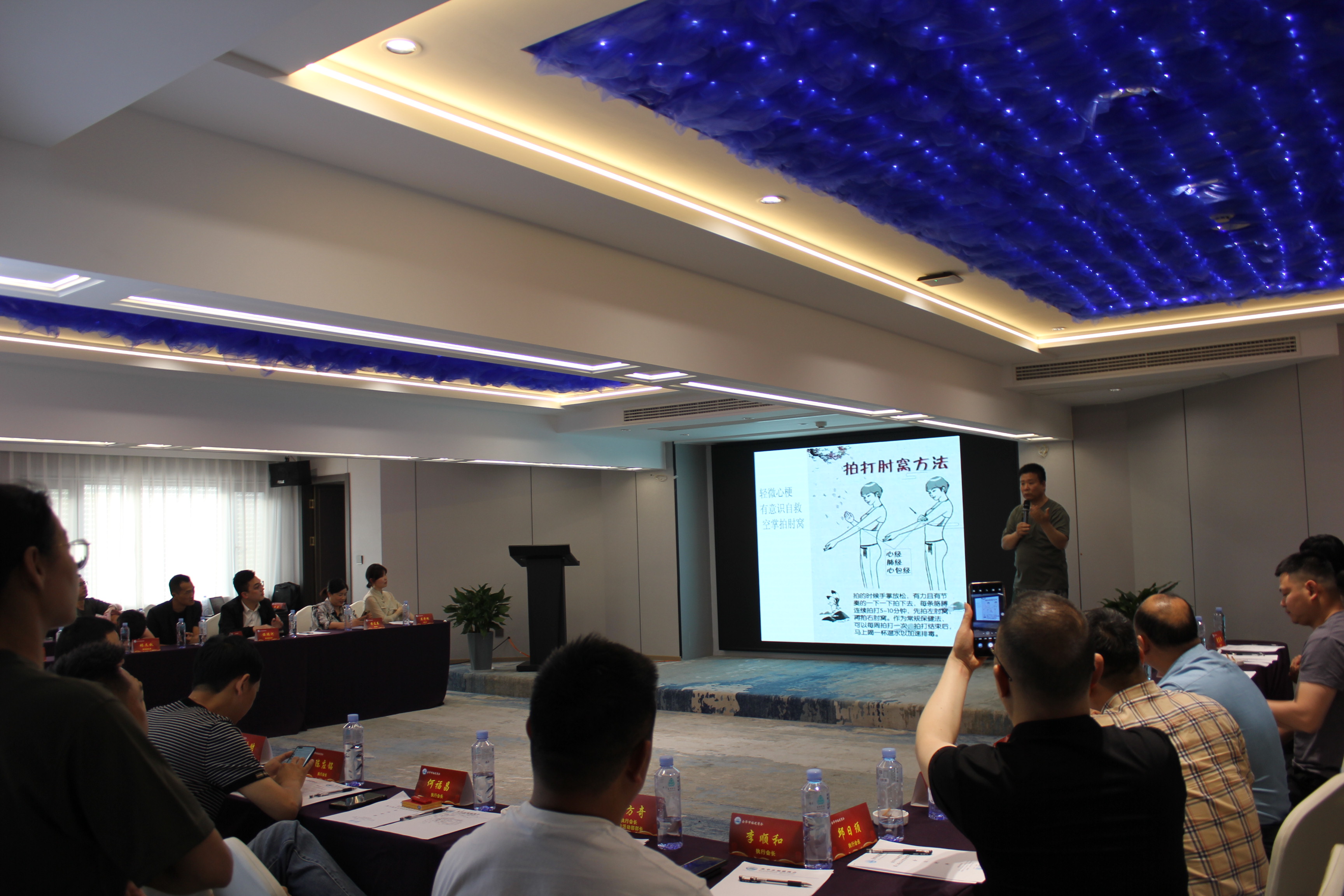 为弘扬中华医学文化,丰富商会成员处理应急突发病变的能力,商会特邀请金华市爱国拥军促进会中医救援专业委员会到场,为本次会议进行了心梗脑梗中医急救专业知识讲座,全体与会成员也学到了中医医学救援的相关知识。