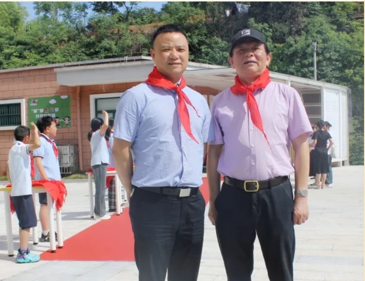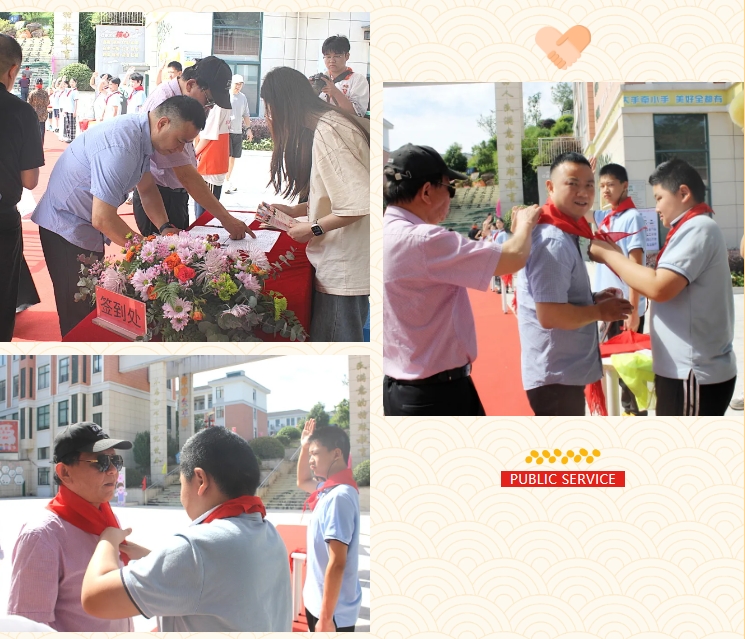 学生们列队欢迎,并为活动参加人员佩戴红领巾。