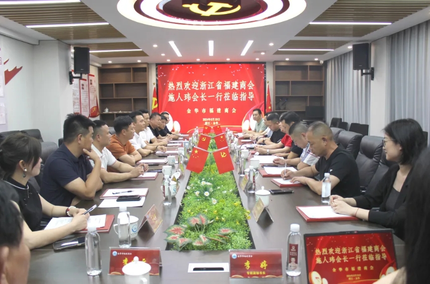 6月19日,浙江省福建商会会长施人玮、监事长施亮、执行会长兼党支部副书记陈灿军、执行会长朱玉鹤、常务副会长刘发来、林万顺,副秘书长陈波、汤荣辉,秘书处任佳佳一行9人莅临我会指导交流,金华市福建商会会长林建阳、监事长李家熊、秘书长刘建福、党支部书记张永利、执行会长洪维浅、李顺和、刘方奇,常务副会长何泽坤,副会长吴奇殊,商会顾问李向云、副秘书长李婷热情接待。