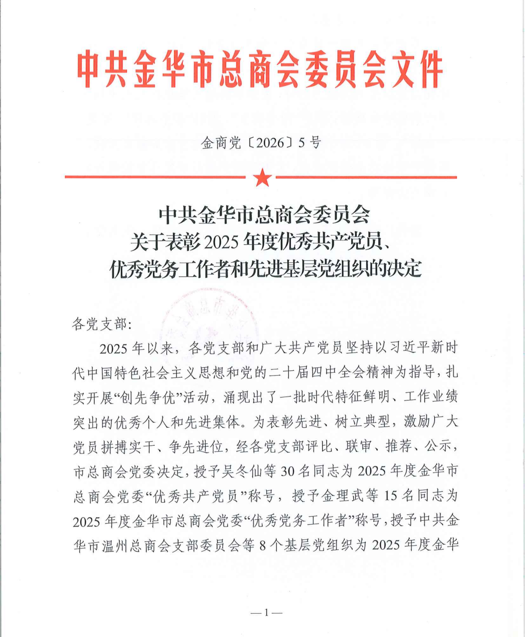 3月13日,中共金华市总商会委员会发布《关于表彰 2025 年度优秀共产党员、优秀党务工作者和先进基层党组织的决定》(金商党〔2026〕5 号),中共金华市福建商会支部委员会再次荣获“先进基层党组织”称号!